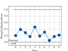 >>> from torch import rand, randint >>> # Example plotting multiple values >>> from torchmetrics.classification import BinaryCalibrationError >>> metric = BinaryCalibrationError(n_bins=2, norm='l1') >>> values = [ ] >>> for _ in range(10): ... values.append(metric(rand(10), randint(2,(10,)))) >>> fig_, ax_ = metric.plot(values)