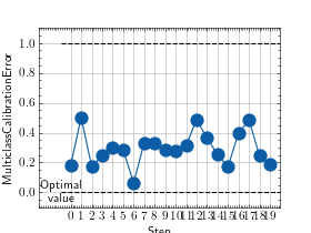 >>> from torch import randn, randint >>> # Example plotting a multiple values >>> from torchmetrics.classification import MulticlassCalibrationError >>> metric = MulticlassCalibrationError(num_classes=3, n_bins=3, norm='l1') >>> values = [] >>> for _ in range(20): ... values.append(metric(randn(20,3).softmax(dim=-1), randint(3, (20,)))) >>> fig_, ax_ = metric.plot(values)