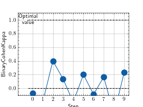 >>> from torch import rand, randint >>> # Example plotting multiple values >>> from torchmetrics.classification import BinaryCohenKappa >>> metric = BinaryCohenKappa() >>> values = [ ] >>> for _ in range(10): ... values.append(metric(rand(10), randint(2,(10,)))) >>> fig_, ax_ = metric.plot(values)
