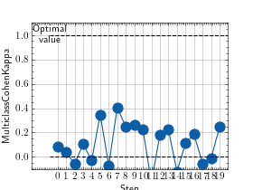 >>> from torch import randn, randint >>> # Example plotting a multiple values >>> from torchmetrics.classification import MulticlassCohenKappa >>> metric = MulticlassCohenKappa(num_classes=3) >>> values = [] >>> for _ in range(20): ... values.append(metric(randn(20,3).softmax(dim=-1), randint(3, (20,)))) >>> fig_, ax_ = metric.plot(values)