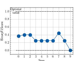>>> from torch import rand, randint >>> # Example plotting multiple values >>> from torchmetrics.classification import BinaryF1Score >>> metric = BinaryF1Score() >>> values = [ ] >>> for _ in range(10): ... values.append(metric(rand(10), randint(2,(10,)))) >>> fig_, ax_ = metric.plot(values)
