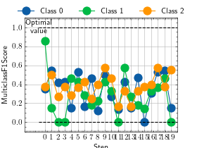 >>> from torch import randint >>> # Example plotting a multiple values per class >>> from torchmetrics.classification import MulticlassF1Score >>> metric = MulticlassF1Score(num_classes=3, average=None) >>> values = [] >>> for _ in range(20): ... values.append(metric(randint(3, (20,)), randint(3, (20,)))) >>> fig_, ax_ = metric.plot(values)