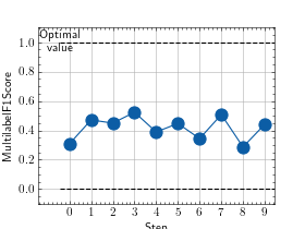 >>> from torch import rand, randint >>> # Example plotting multiple values >>> from torchmetrics.classification import MultilabelF1Score >>> metric = MultilabelF1Score(num_labels=3) >>> values = [ ] >>> for _ in range(10): ... values.append(metric(randint(2, (20, 3)), randint(2, (20, 3)))) >>> fig_, ax_ = metric.plot(values)
