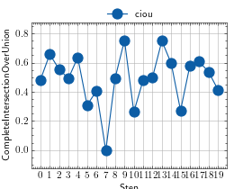 >>> import torch >>> from torchmetrics.detection import CompleteIntersectionOverUnion >>> preds = [ ... { ... "boxes": torch.tensor([[296.55, 93.96, 314.97, 152.79], [298.55, 98.96, 314.97, 151.79]]), ... "scores": torch.tensor([0.236, 0.56]), ... "labels": torch.tensor([4, 5]), ... } ... ] >>> target = [ ... { ... "boxes": torch.tensor([[300.00, 100.00, 315.00, 150.00]]), ... "labels": torch.tensor([5]), ... } ... ] >>> metric = CompleteIntersectionOverUnion() >>> metric(preds, target) {'ciou': tensor(0.8611)}